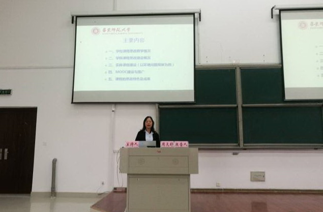 周天舒从华东师范大学课程思政开展情况、生态与环境科学学院课程思政开展情况、实体课程课程思政建设、MOOC课程思政建设与推广、课程的思政特色及成果等五个方面作了题为《课程思政在环境专业课程教学中的探索与实践》的报告,报告内容翔实,贴近课堂,深入浅出,以实际案例详细阐述了如何进行课程思政教学,现场反响热烈,效果明显。