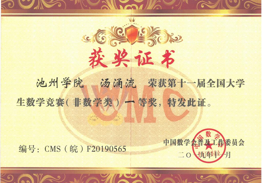 近日,第十一届全国大学生数学竞赛安徽赛区获奖结果揭晓,永利官网荣获非数学专业组一等奖1项,二等奖1项,三等奖2项,其中2017级环境工程专业学生汤涌流(指导教师:周恺)获得一等奖,2018级财务管理专业学生周峰(指导教师:王小可)获得二等奖。