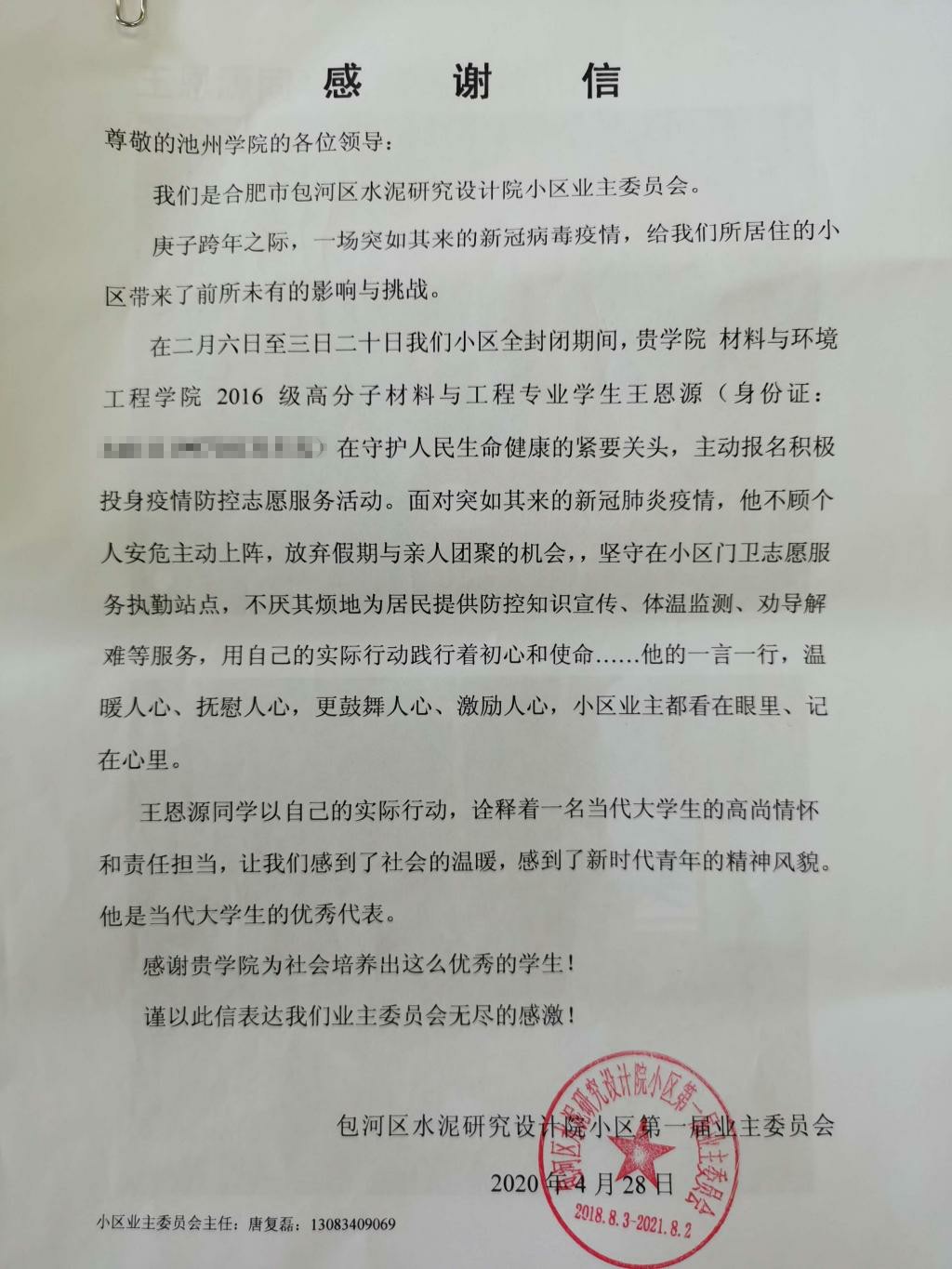 面对突如其来的新冠肺炎疫情,材料与环境工程学院2016级高分子材料与工程专业学生党员王恩源,不顾个人安危,长期坚守在小区志愿服务执勤站点,不厌其烦地为居民宣讲防控知识、测量体温,积极开展劝导解难服务,用自己的实际行动践行着初心和使命,守护群众的生命健康。王恩源同学的表现得到了合肥市包河区水泥研究院小区居民的一致赞扬,小区业主委员会还特地写来感谢信,感谢学校为社会培养出优秀的学生。从王恩源同学的身上折射出当代大学生有理想、有信念、有担当的精神风貌。