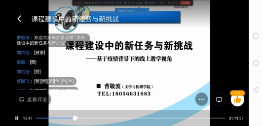 5月22日,曹敬波老师以《课程建设中的新任务与新挑战——基于疫情背景下的线上教学视角》为主题,围绕课程建设的基本内容、课程建设的新要求、课程建设的新挑战、课程建设的原则等四个方面进行了详细的阐述,介绍了广播电视编导专业课程建设与线上教学开展情况,分享了教学微视频制作的技巧。