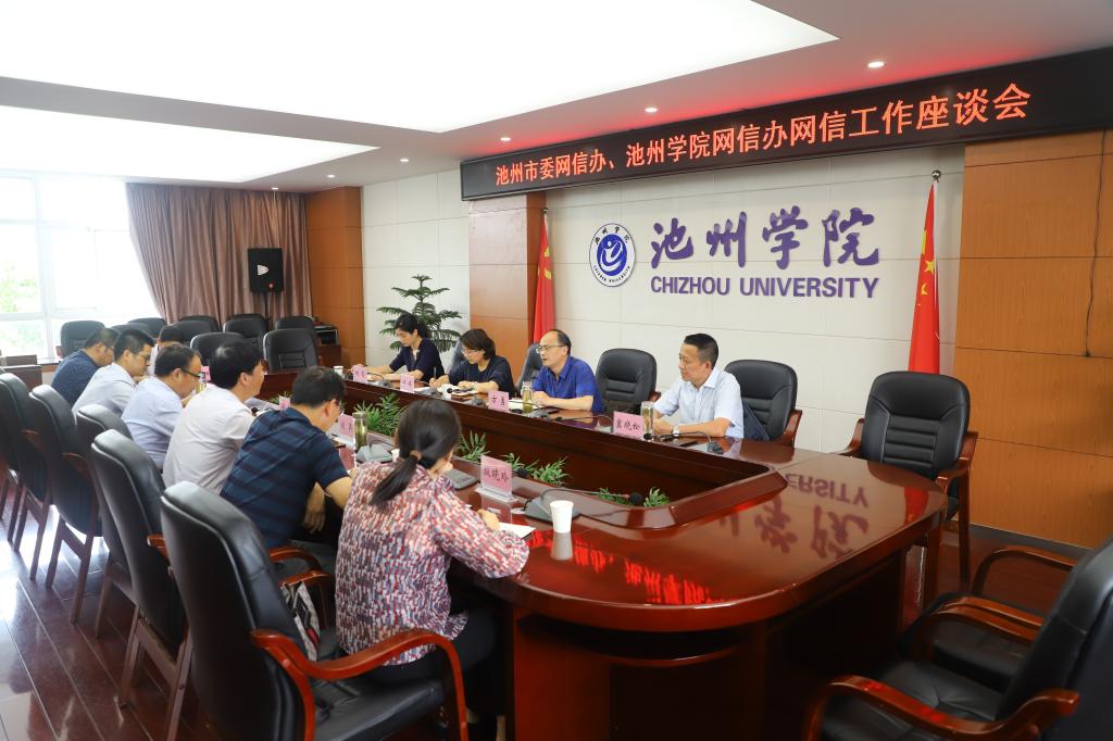 5月27日,池州市委网信办到永利官网调研指导网信工作,双方就网络安全和信息化建设进行座谈。校党委书记孙晓峰,党委副书记崔国发接待了市委网信办主任方勇一行。座谈会由校党委委员、宣传部长、网信办主任胡兵主持。