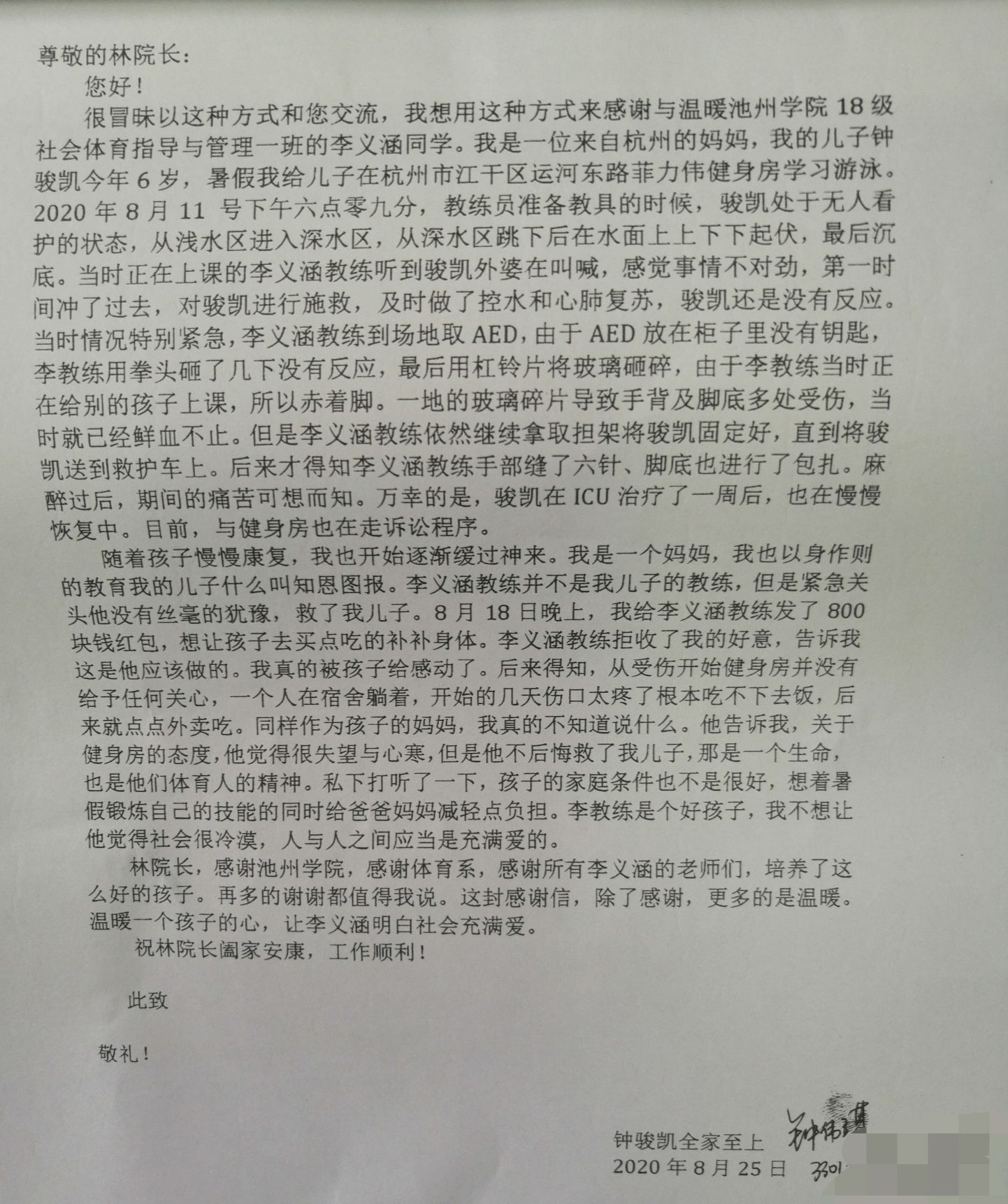 万幸的是,医生说多亏发现抢救及时,孩子并没有生命危险,但还需要住院观察。男孩在接受了一段时间的治疗后,于8月21日康复并出院。8月25日,孩子的母亲钟女士写了一封感谢信,表示被李义涵教练关键时刻不顾一切、无私奉献的精神所感动,同时她也感谢ylzzcom永利总站线路检测能够培养出这么优秀的学生。