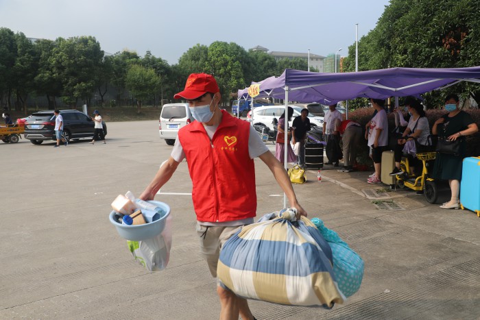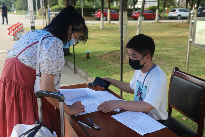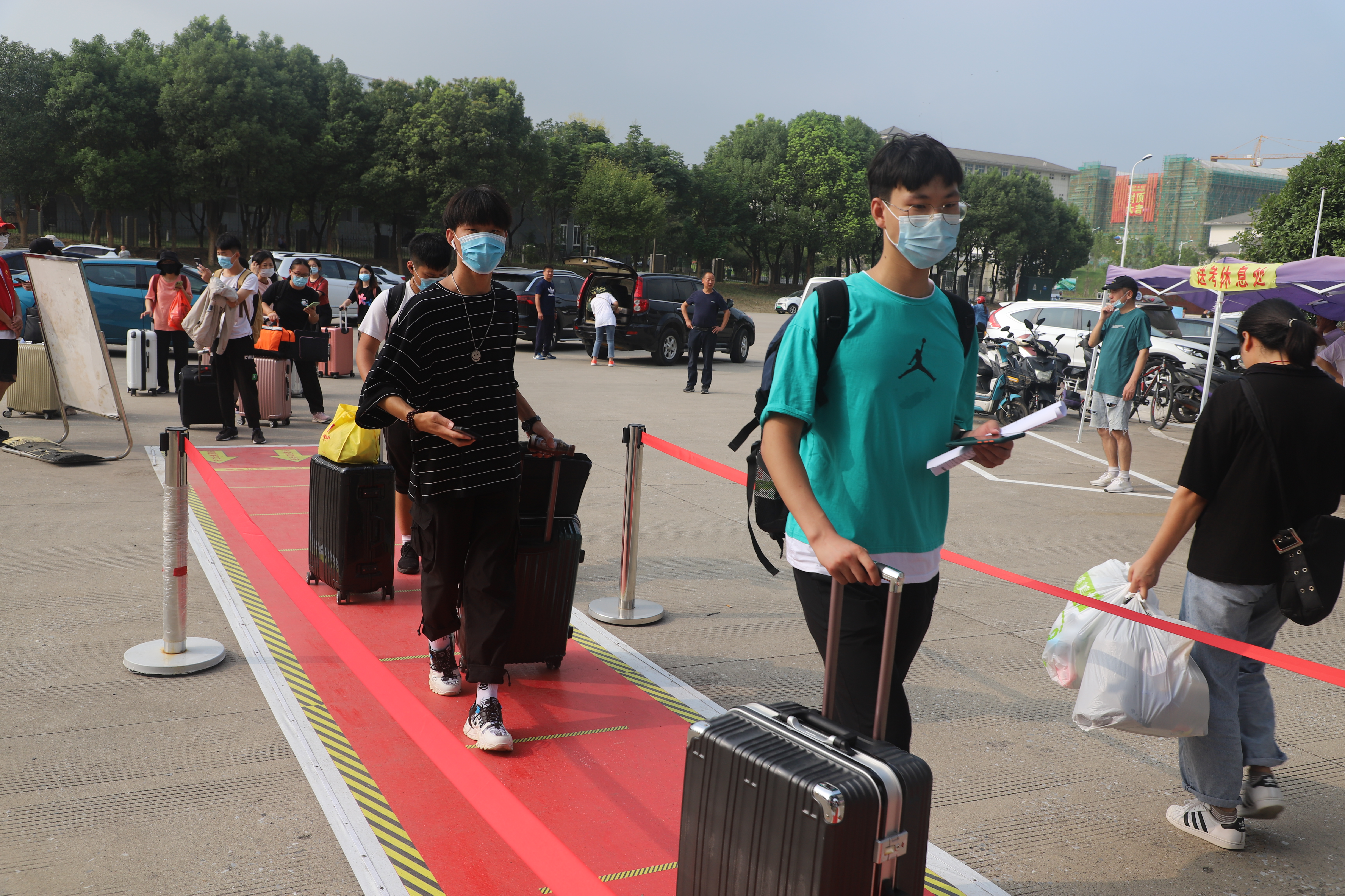 迎接返校学生的学院在教学楼前设置接待点,帮助学生登记填写信息;门卫们认真仔细给学生测温验码;志愿者们帮助学生搬运行李,整个校园里充满了欢声笑语。