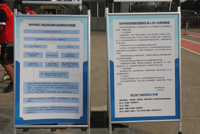 各个教学楼前的电子屏上滚动播放欢迎学生回家的新学期祝福标语,校门口设置疫情防控门卫管理制度,提醒广大学生保持疫情防控的警惕性,落实疫情防控各项措施。