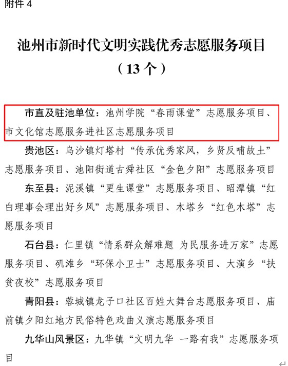 日前,2020年池州市新时代文明实践优秀志愿服务项目及团队活动结果揭晓,永利官网“春雨课堂”志愿服务项目入选池州市新时代文明实践优秀志愿服务项目。