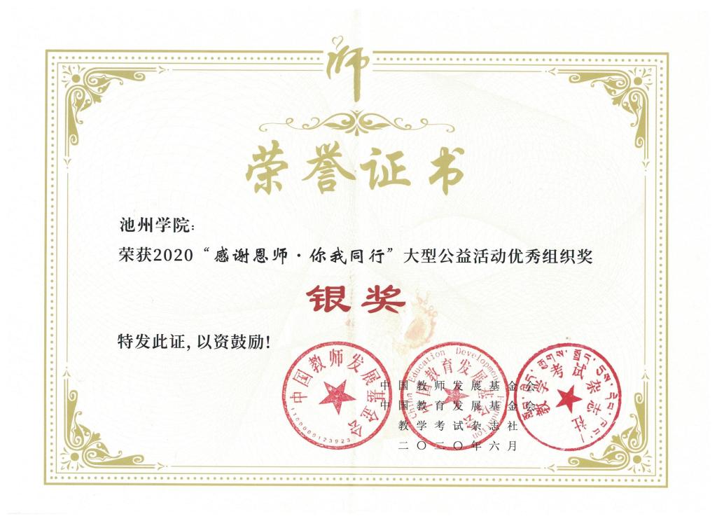 近日,2019年度“感谢恩师·你我同行”大型公益活动圆满结束,永利官网荣获全国“优秀组织奖银奖”、全国“优秀宣传奖”等荣誉称号,文学与传媒学院叶静同学荣获全国“优秀传承奖”,外国语学院周红同学、旅游与历史文化学院陈蓉同学荣获“优秀感恩大使”荣誉称号。