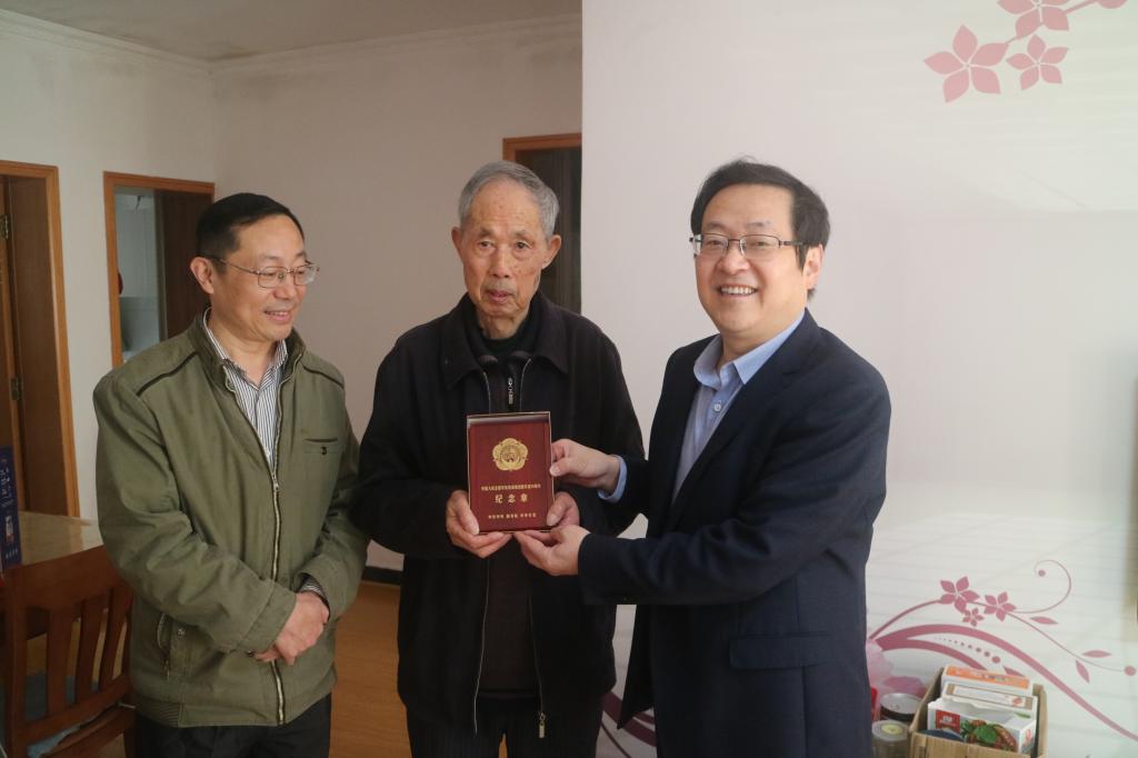 日前,永利官网周盛举、陈楼泉、章家珠三位离退休老同志获得由中共中央、国务院、中央军委颁发的“中国人民志愿军抗美援朝出国作战70周年”纪念章。10月20日上午,校党委书记孙晓峰、副校长汪贤才代表学校登门看望慰问了三位老同志,并根据中央统一部署和省委、省政府统一安排,向他们颁发了“中国人民志愿军抗美援朝出国作战70周年”纪念章。