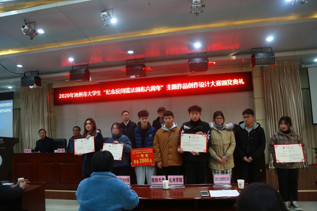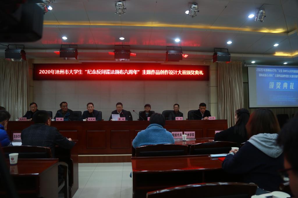 11月30日下午,由池州市法治宣传教育工作领导小组办公室主办,ylzzcom永利总站线路检测、池州职业技术学院、安徽卫生健康职业学院承办,池州市广告协会协办的2020年池州市大学生“纪念反间谍法颁布六周年”主题作品创作设计大赛颁奖典礼在永利官网行政南二楼会议室举行。