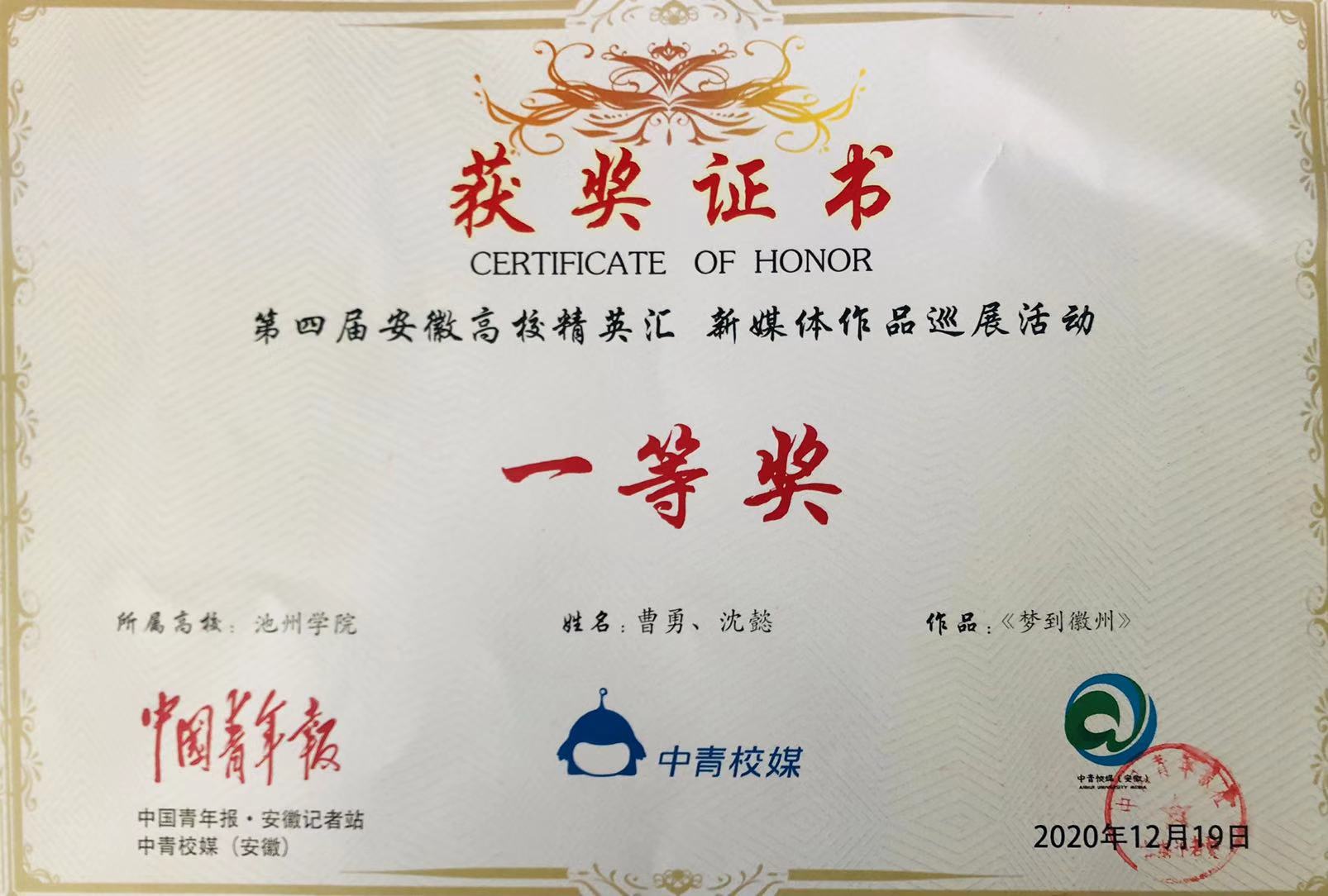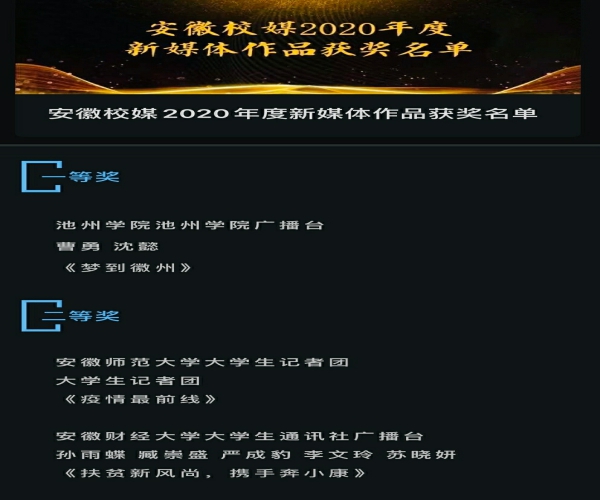 活动由中国青年报安徽记者站主办,中青校媒(安徽)承办。会上对安徽高校2020年度“十佳校媒”、“优秀新媒体作品”等进行了评选颁奖。永利官网广播台学生曹勇、沈懿的作品《梦到徽州》(指导老师:刘德群、袁梦成)在此次评选中荣获安徽省新媒体作品音频类“一等奖”。