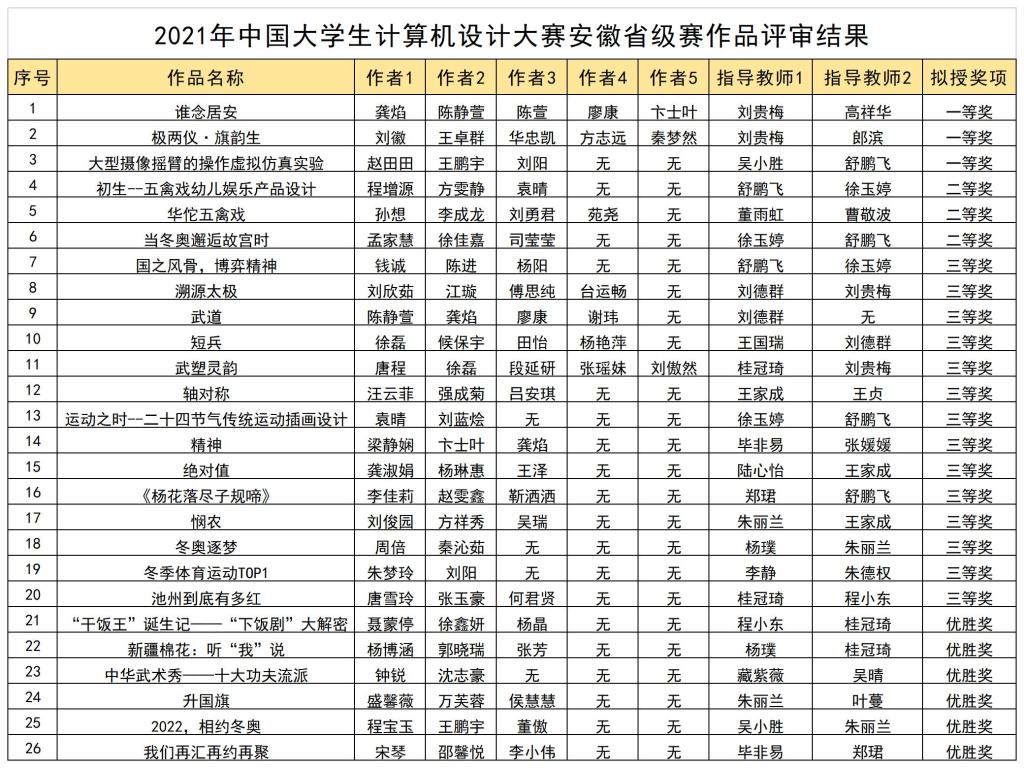5月31日,2021(第14届)中国大学生计算机设计大赛安徽赛区评选结果公布,我院报送的作品共有26件获奖,其中获一等奖3项、二等奖3项、三等奖14项、优秀奖6项。6项作品将被推荐参加2021年第14届中国大学生计算机设计大赛全国总决赛。