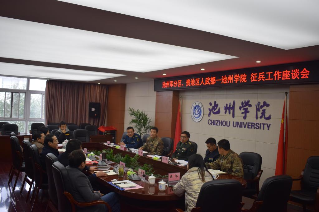 12月15日上午,池州军分区司令员贡建、副司令员韩立民、动员处处长渠胜红以及贵池区人武部政委冯涛、部长夏阳等一行来永利官网调研征兵工作。院党委书记孙晓峰主持座谈会,院党委委员、副院长汪贤才参加会议。