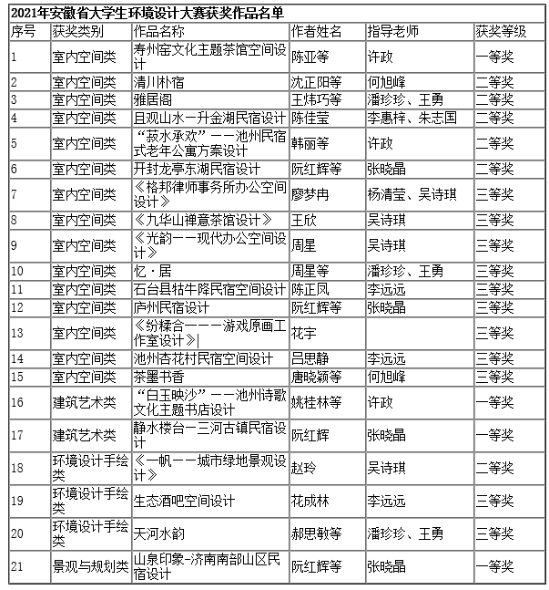 由安徽省教育厅主办、安徽工程大学承办的“2021年第三届安徽省大学生环境设计大赛”评审圆满结束,永利官网学生作品从全省60多所高校2855件作品中脱颖而出,再次斩获一等奖4项、二等奖6项、三等奖11项。