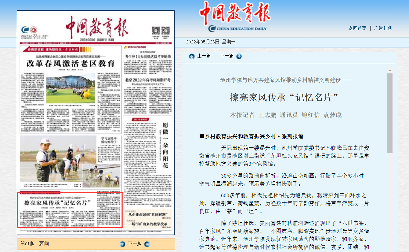 5月23日,《中国教育报》头版以《ylzzcom永利总站线路检测与地方共建家风馆推动乡村精神文明建设——擦亮家风传承“记忆名片”》为题报道永利官网家风文化助力乡村振兴工作。同时,在中国教育新闻网以头条形式重点推出。