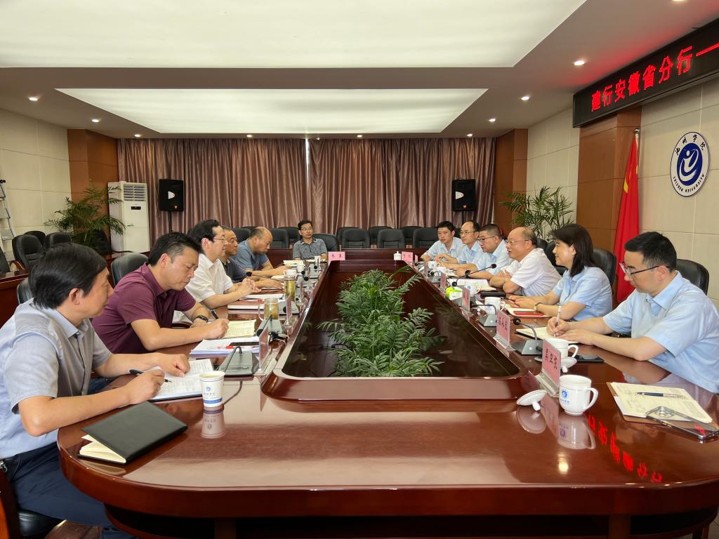 8月11日上午,中国建设银行安徽省分行行长邹致师、资深副经理伍苹、授信审批部总经理王刚、办公室副主任陈永宏、池州市分行行长高小飞等一行7人到永利官网调研交流。院党委书记孙晓峰主持座谈会并讲话,院纪委书记、监察专员汪海出席座谈会。