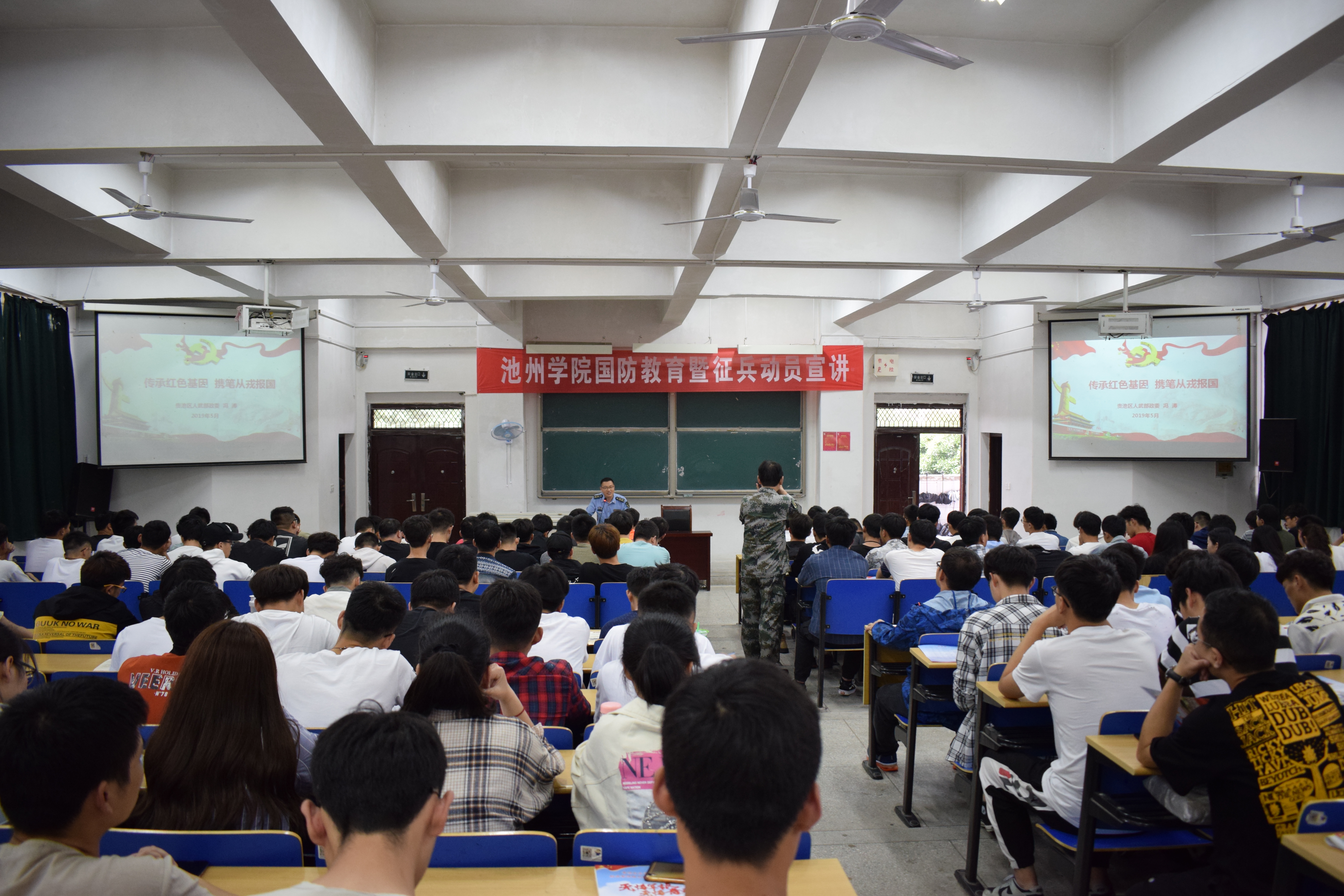 5月15日,永利官网在博弈楼阶梯教室举行国防教育暨征兵动员报告会。报告会特邀贵池区人武部政委冯涛为主讲嘉宾,二级学院学生代表近300人聆听了报告。